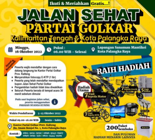 Dijelaskannya, untuk jalan sehat dibuka mulai 5 sampai 15 Oktober 2022 di Kantor DPD Partai Golkar Kalteng Jl. Imam Bonjol Palangka Raya dan tidak dipungut biaya.