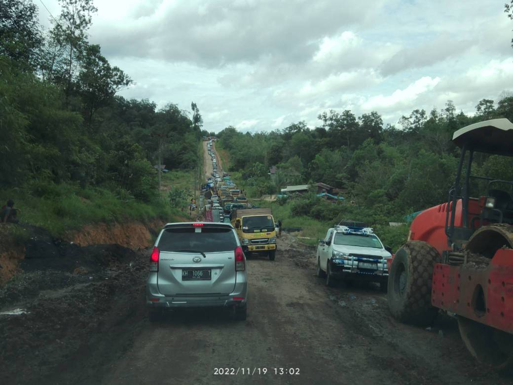 Talawangnews.com, Gunung Mas – Sudah kurang lebih dua hari jalan lintas Palangka Raya menuju Kuala Kurun terhambat kemacetan, tepatnya di wilayah desa Rabauh Kabupaten Gunung Mas. Hal ini terjadi karena adanya truk-truk PBS (Perusahaan Besar Swasta) yang melintasi jalan tersebut melebihi kapasitas beban jalan.