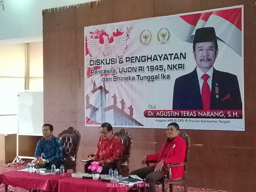 TALAWANG NEWS, PALANGKA RAYA – Anggota DPD RI Dr. Agustin Teras Narang, S.H., M.H. menggelar kegiatan Diskusi dan Penghayatan Pancasila, UUD RI 1945, NKRI dan Bhineka Tunggal Ika dengan Asosiasi Pendeta Indonesia Kalimantan Tengah di aula Cristian Center yang berlokasi di jalan Diponegoro Kota Palangka Raya, Jumat (28/4/2023).