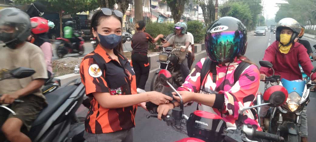 TALAWANG NEWS, PALANGKA RAYA – Kabut asap yang semakin pekat di kota Palangka Raya sangat mengganggu kesehatan maupun jarak pandang berkendaraan, sebagai bentuk kepedulian, Srikandi Pemuda Pancasila Kalimantan Tengah dan juga dalam rangka menyambut Hari Ulang Tahun Srikandi Pemuda Pancasila ke 40 Tahun, Srikandi Pemuda Pancasila Kalimantan Tengah membagikan 6.000 masker kepada masyarakat Kota Palangka Raya yang melintas di lampu merah S. Parman. Sabtu 07/10/2023 sore.