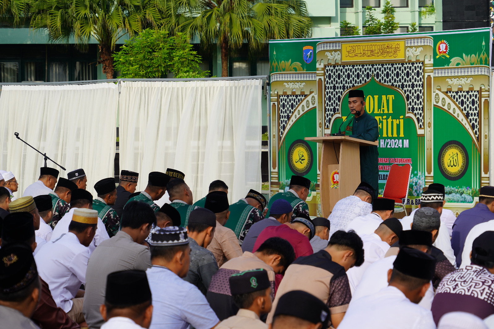 “Tepat di hari ini kita semua merayakan Hari Raya Idul Fitri 1445/H,hari kemenangan dan hari suci bagi hamba-hamba Allah yang telah berjuang selama satu bulan penuh dengan berpuasa di siang hari dan memperbanyak ibadah di malam harinya, kemenangan ini bukan diraih dengan biasa-biasa saja melainkan dengan susah payah dan penuh dengan pengorbanan,”tuturnya.