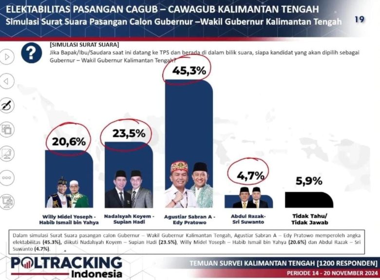 Survei yang dilakukan pada 14-20 November 2024 ini menunjukkan bahwa elektabilitas Agustiar-Edy mencapai 45,3 persen, jauh mengungguli pesaing terdekat mereka, pasangan Nadalsyah Koyem-Supian Hadi (23,5 persen), serta pasangan Willy Midel Yoseph-Habib Ismail bin Yahya (20,6 persen) dan Abdul Razak-Sri Suwanto (4,7 persen).