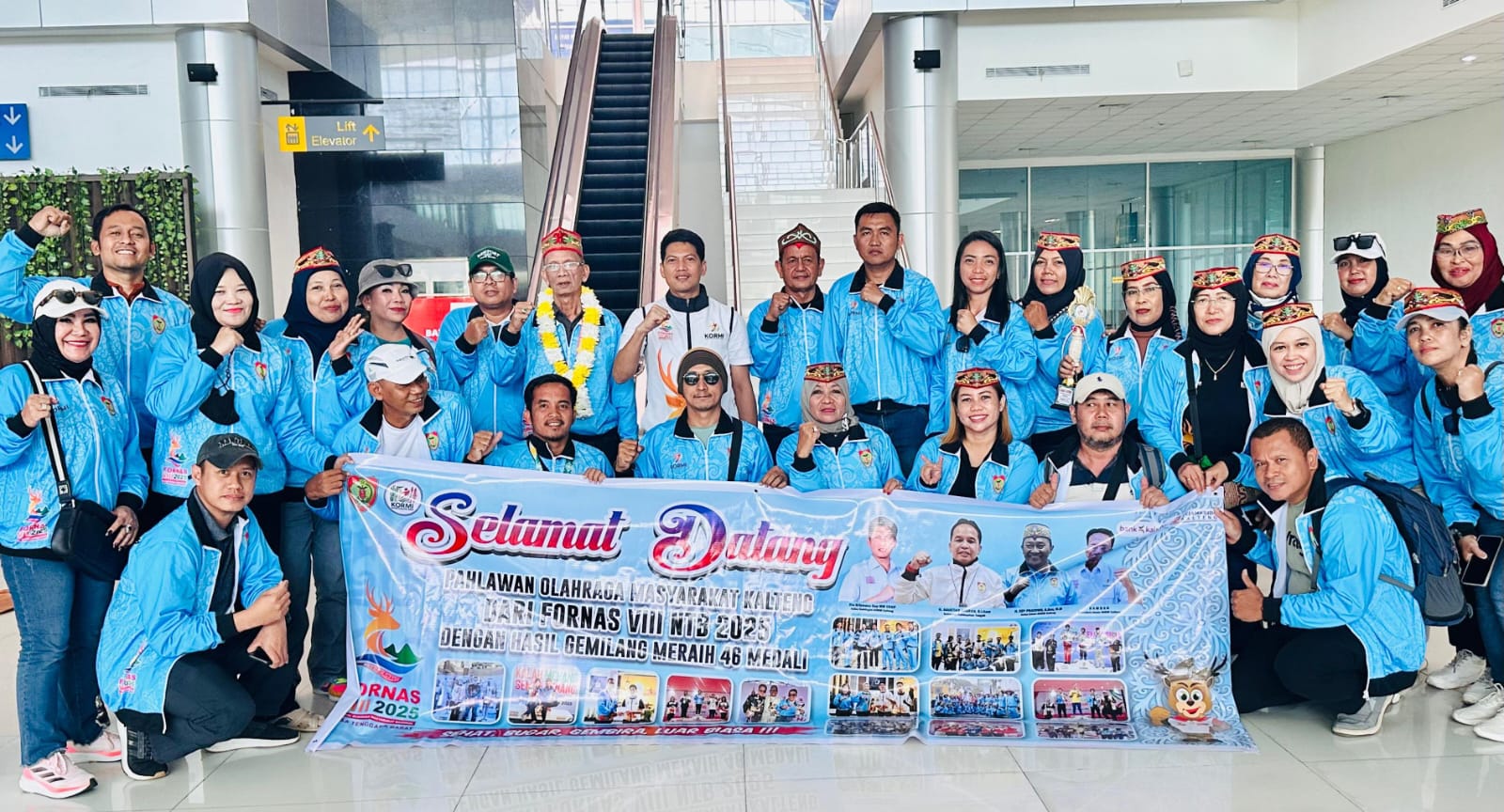 PALANGKA RAYA — Suasana penuh haru dan kebanggaan menyambut kedatangan Kontingen Komite Olahraga Rekreasi Masyarakat Indonesia (KORMI) Kalimantan Tengah di Bandara Tjilik Riwut, Palangka Raya, Minggu (3/8/2025). Mereka kembali dari ajang Festival Olahraga Rekreasi Nasional (FORNAS) VIII di Nusa Tenggara Barat (NTB) dengan membawa oleh-oleh istimewa: 46 medali untuk Bumi Tambun Bungai.
